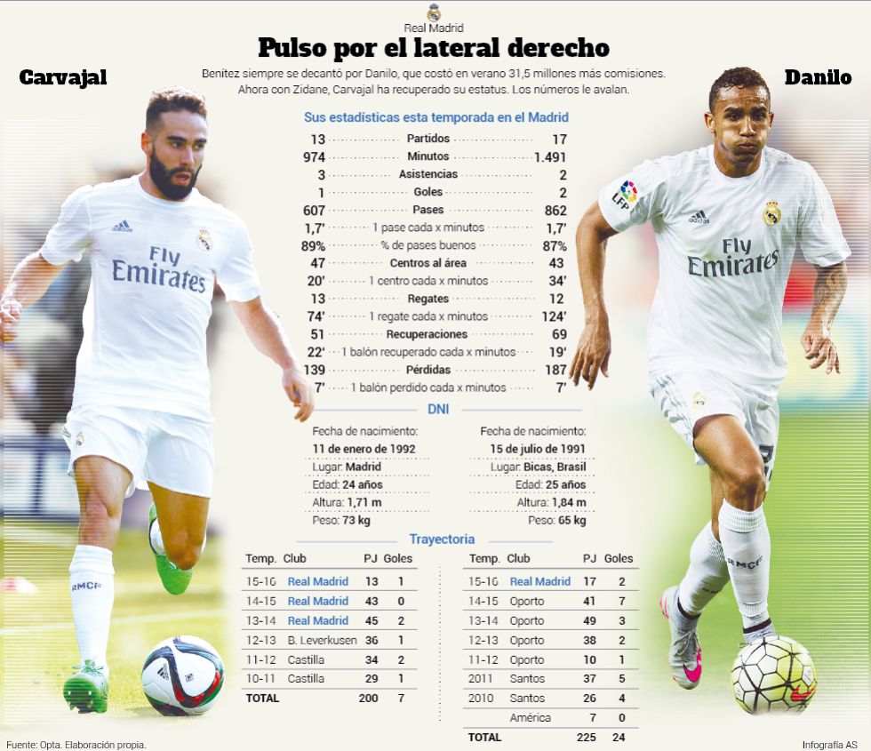 В матчах против «Депортиво» и «Спортинга» Данило не сыграл ни одной минуты – на позиции правого латераля в этих встречах полностью отыграл Дани Карвахаль, который нечасто выходил на поле при Рафаэле Бенитесе. Статистика Карвахаля впечатляет: несмотря на то, что он отыграл в этом сезоне на 517 минут меньше, чем Данило, его статистика по многим показателям превосходит бразильца. Карвахаль чаще переводит мяч с фланга в центр поля (он делает это каждые 20 минут игрового времени), чаще вступает в обводку (каждые 74 минуты) и имеет лучший процент точных передач (89%). При этом воспитанник мадридской фабрики ещё и эффективнее действует непосредственно в защите: он превосходит Данило по количеству отборов и лишь по количеству забитых голов преимущество на стороне бывшего латераля «Порту», но он провёл на поле гораздо больше времени.