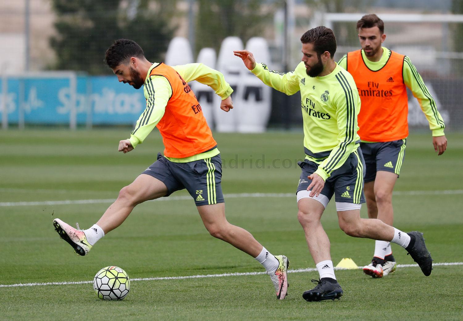 Тренировочная сессия, основное внимание в которой было уделено работе с мячом, началась с отработки движения мяча и создания давления на малых участках поля, после чего игроки разделились на две группы для выполнения интенсивных упражнений на владение мячом. Помимо основного состава, в тренировке принимал участие футболист «Кастильи» Борха Майораль.