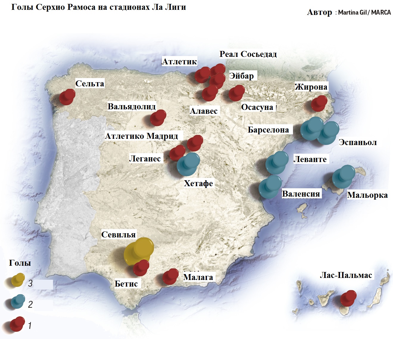 В воскресенье на «Эль-Садар» капитан мадридского «Реала», поразив ворота соперников, приколол очередную булавку на своей карте забитых мячей: Рамос забил почти на каждом стадионе в Ла Лиге.