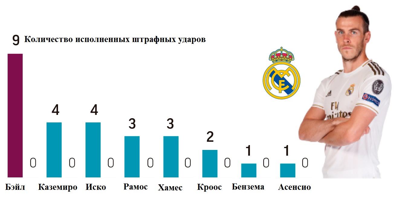 В нынешнем составе Зинедина Зидана всего шесть игроков, которые раньше забивали со штрафного удара – Бэйл (трижды – последний раз в 2015 году), Хамес Родригес (три), Иско, Маркос Асенсио, Серхио Рамос и Начо (все по одному).