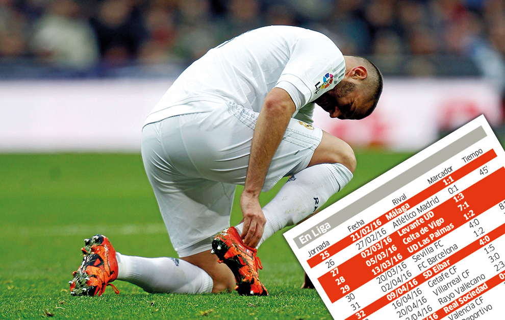 Но с 21 февраля у француза начались проблемы. Бенезема не попал в заявку на матч 25-го тура Ла Лиги против «Малаги» из-за болей в бедре. Эта проблема, казалось, должна была быть решена к следующему матчу – мадридскому дерби на «Бернабеу» – но в тот день Бензема смог провести на поле только 45 минут, после чего был заменен. В результате французский нападающий пропустил 3 тура домашнего чемпионата – матчи с «Леванте», «Сельтой» и «Лас Пальмас» – и ответный матч 1\8 финала Лиги Чемпионов против «Ромы».
