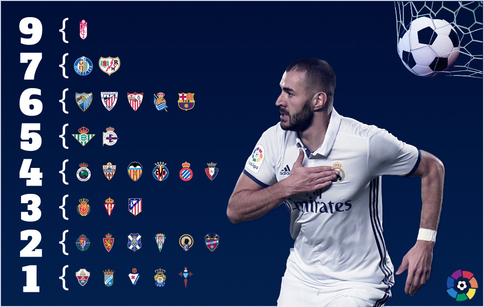 Любимой жертвой 28-летнего нападающего стала «Гранада», в ворота которой он забил девять голов. Затем идут «Хетафе» и «Райо Вальекано» с семью пропущенными мячами. Также Карим Бензема по шесть раз поражал сетку ворот «Малаги», «Атлетика», «Севильи», «Реал Сосьедад» и «Барселоны».