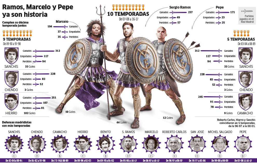 Серхио Рамос, Марсело и Пепе проводят вместе уже десятый сезон в защите мадридского «Реала». Пепе пришел в клуб летом 2007 года, за полгода до него, вместе с Гонсало Игуаином и Фернандо Гаго, в «Мадриде» появился бразилец Марсело, а Серхио Рамос стал частью Королевского клуба раньше всех своих сегодняшних товарищей – в 2005 году. Кто бы мог тогда представить, что это трио будет успешно действовать в защите на протяжении 10 сезонов подряд? Такое в истории Королевского клуба случилось впервые.