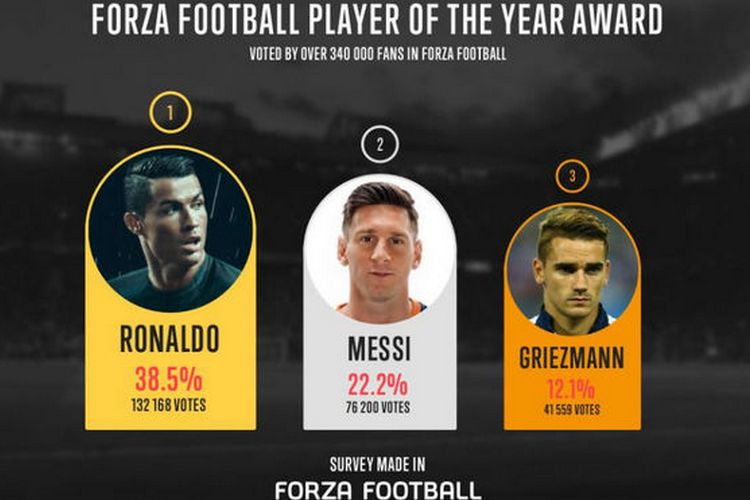Криштиану Роналду стал игроком года по мнению пользователей приложения Forza Football, опередив Лионеля Месси и Антуана Гризманна. В голосовании приняло участие 350 000 футбольных болельщиков по всему миру.
