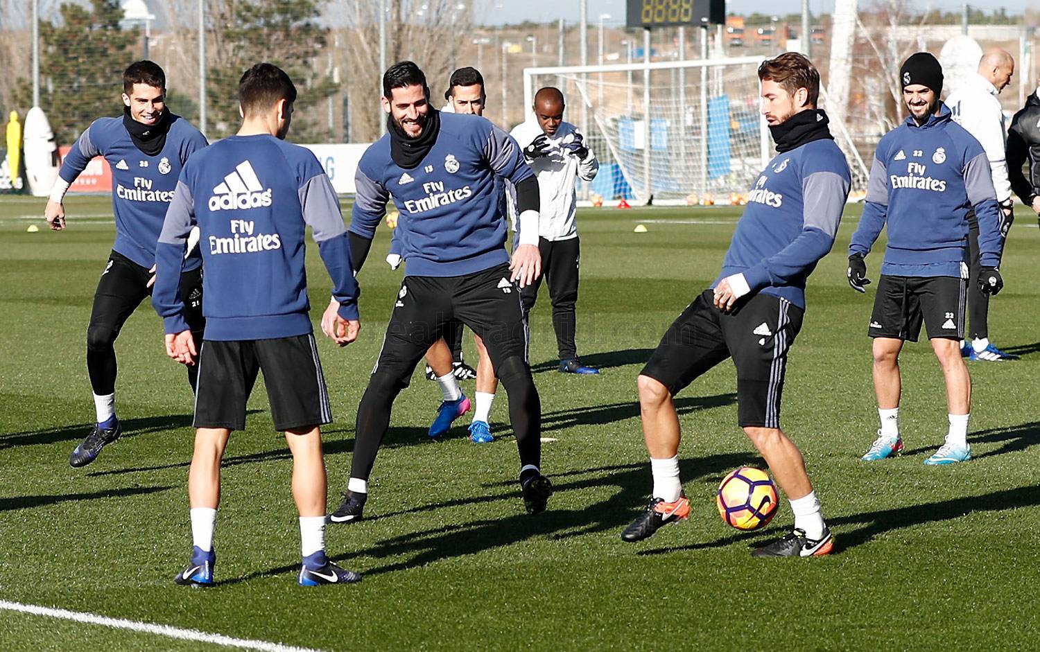 «Реал Мадрид» провел в субботу тренировочную сессию, завершающую подготовку к матчу 20-го тура Ла Лиги против «Реал Сосьедад» (встреча состоится на «Сантьяго Бернабеу» в воскресенье, 29 января, в 22:45 по московскому времени). В рамках тренировочного занятия, сфокусированного на работе с мячом, игроки Королевского клуба отрабатывали упражнения на владение мячом и прессинг, навесы и удары по воротам, а также сыграли несколько матчей на малых полях Вальдебебас.