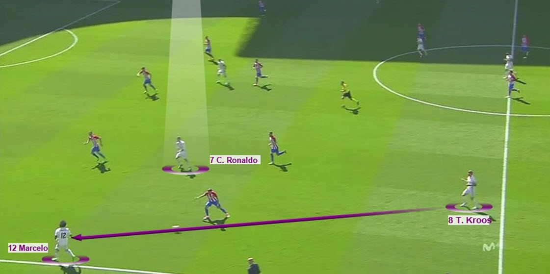 «Реал Мадрид» показал, как при фланговой атаке за счёт одновременных действий Марсело на бровке и Криштиану Роналду ближе к центру, можно отрезать правого латераля «Атлетико» Хуанфрана и использовать зону за его спиной.