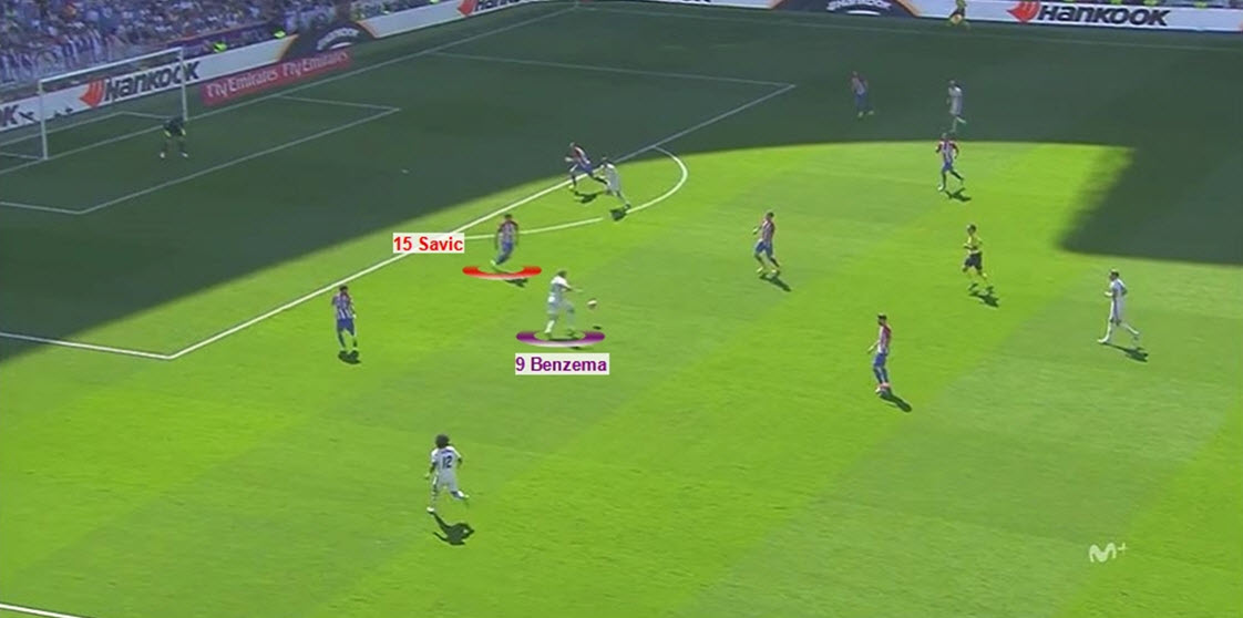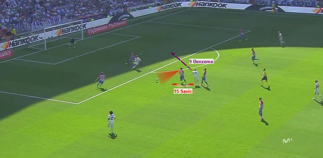 В этом моменте «Атлетико» защищается не лучшим образом. На картинке видно, что Стефан Савич смотрит только на мяч и совсем забыл о своём оппоненте. Это привело к одному из самых опасных моментов у ворот Яна Облака.