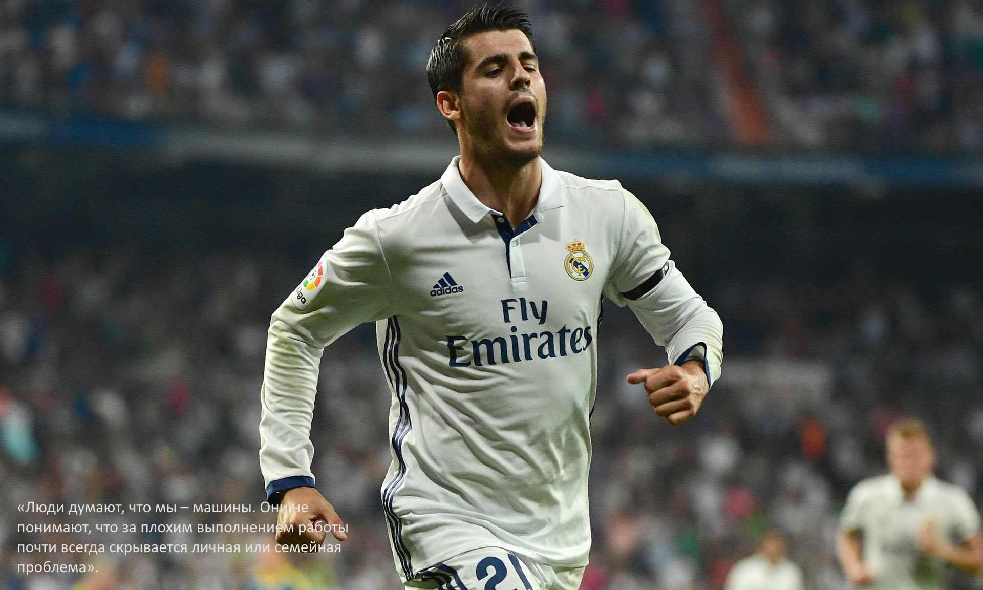 Есть в этих словах 24-летнего игрока что-то трогательное, в нем чувствуется некоторая уязвимость, даже когда он на своей территории. Он честно говорит о том, что на него давят многие факторы, о своей неуверенности и возможных ошибках. Мората говорит о психологии футбола спокойным, уверенным голосом, говоря о простом, но часто забываемом многими факте: игроки – тоже люди. Сидя в головном офисе отеля Las Rozas, мягко потягивая за манжету свою тренировочную майку, Мората обсуждает возможности таланта, свои амбиции, говорит о достигнутом успехе. Разговор также смещается на обсуждение нелегких сторон карьеры: как часто переживал разочарования и приступы неуверенности в себя, это были трудные времена, которые он смог преодолеть, когда в его жизнь вошла Элис.