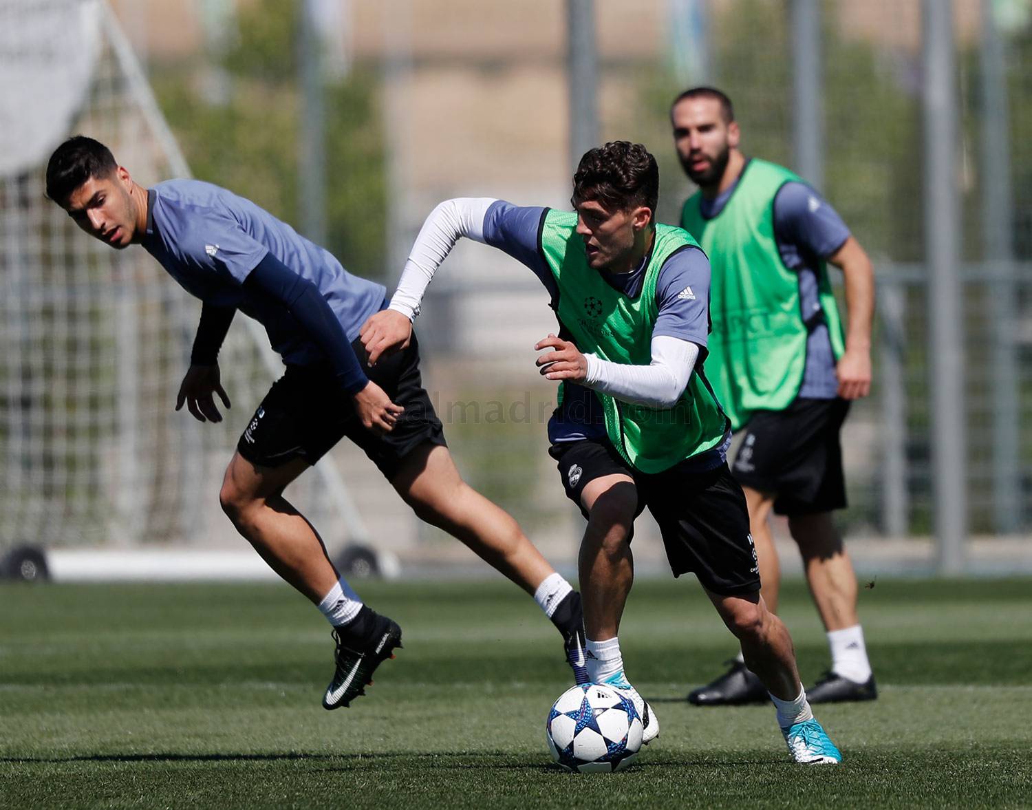 Сегодня «Реал Мадрид» провёл последнее тренировочное занятие перед первым полуфиналом Лиги Чемпионов против «Атлетико», который состоится во вторник в 21:45 по московскому времени на стадионе «Сантьяго Бернабеу». В распоряжении Зинедина Зидана были все футболисты Королевского клуба, кроме Гарета Бэйла, который продолжает восстанавливаться после травмы в тренажёрном зале. Пепе и Фабио Коэнтрао работали по индивидуальной программе на первом и втором полях Вальдебебас.