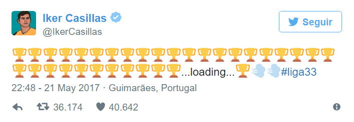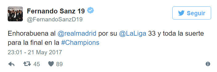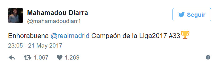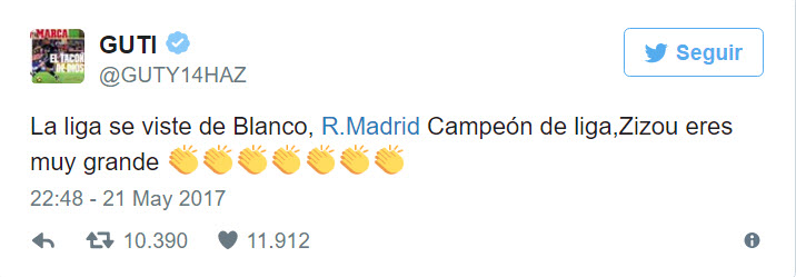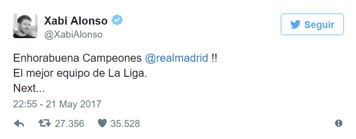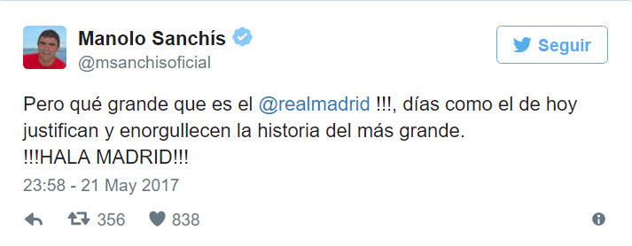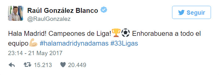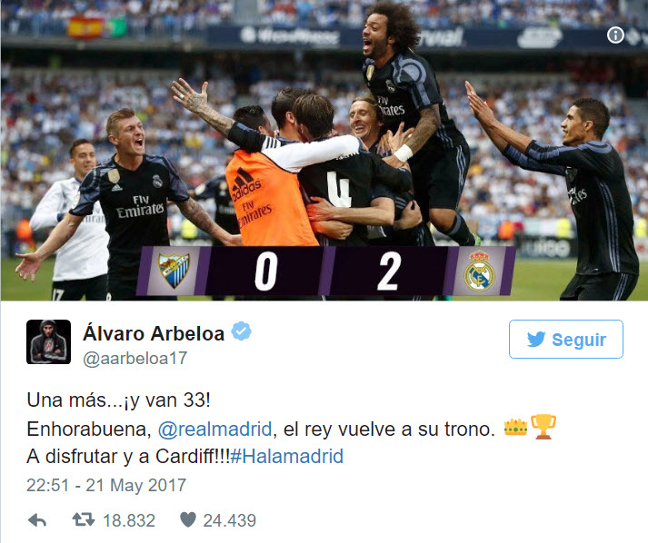 «Ещё одна... и теперь их 33! Поздравляю, «Реал Мадрид», король возвращается на свой трон. Наслаждаемся и готовимся к Кардиффу!!! #Halamadrid».