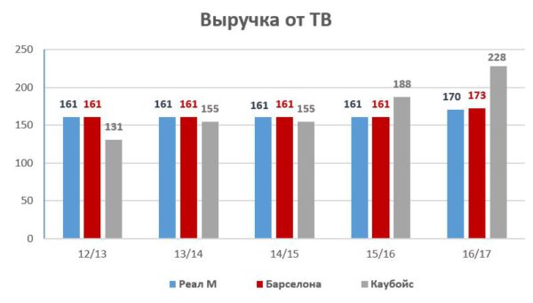 Интересно взглянуть выручку от ТВ-прав. Опять же, у всех трех команд сопоставимые показатели в течение последних 5 лет, но за счет нового соглашения «Каубойс» выходят вперед. Сумма в $228 миллионов — прогноз, основанный на оценке общей стоимости ТВ-прав в $7,3 миллиарда в год. Контракт НФЛ на телевещание рассчитан до конца 2022 года. К тому времени, возможно, «Барселона» и «Реал» догонят американцев по этому показателю за счет нового соглашения Ла Лиги с телекомпаниями и постоянно увеличивающегося дохода от Лиги чемпионов.