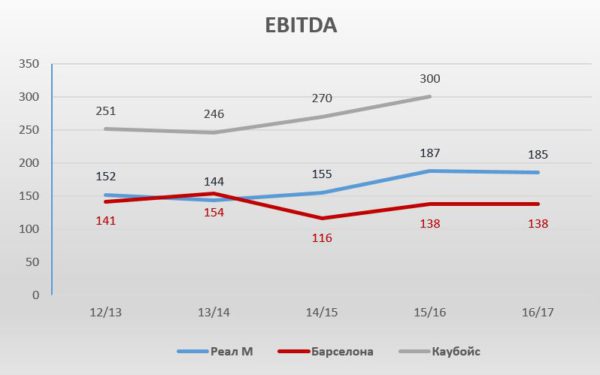 Помимо доходов, важно понять, какие у команд расходы. Сравнивать чистую прибыль клубов невозможно, потому что «Барселона» и «Реал Мадрид» списывают амортизацию за трансферы игроков и недвижимость и платят налоги, в то время, как «Каубойс» не имеют амортизационных отчислений такого рода и не платят налогов как посредник (налоги платит владелец команды Джерри Джонс). Поэтому правильнее будет сравнить EBITDA команд (прибыль до уплаты процентов, налогов и амортизации).