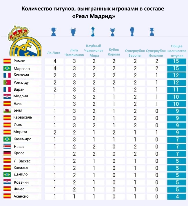 Количество титулов, завоеванных в составе «Реал Мадрид», у нынешних игроков команды.