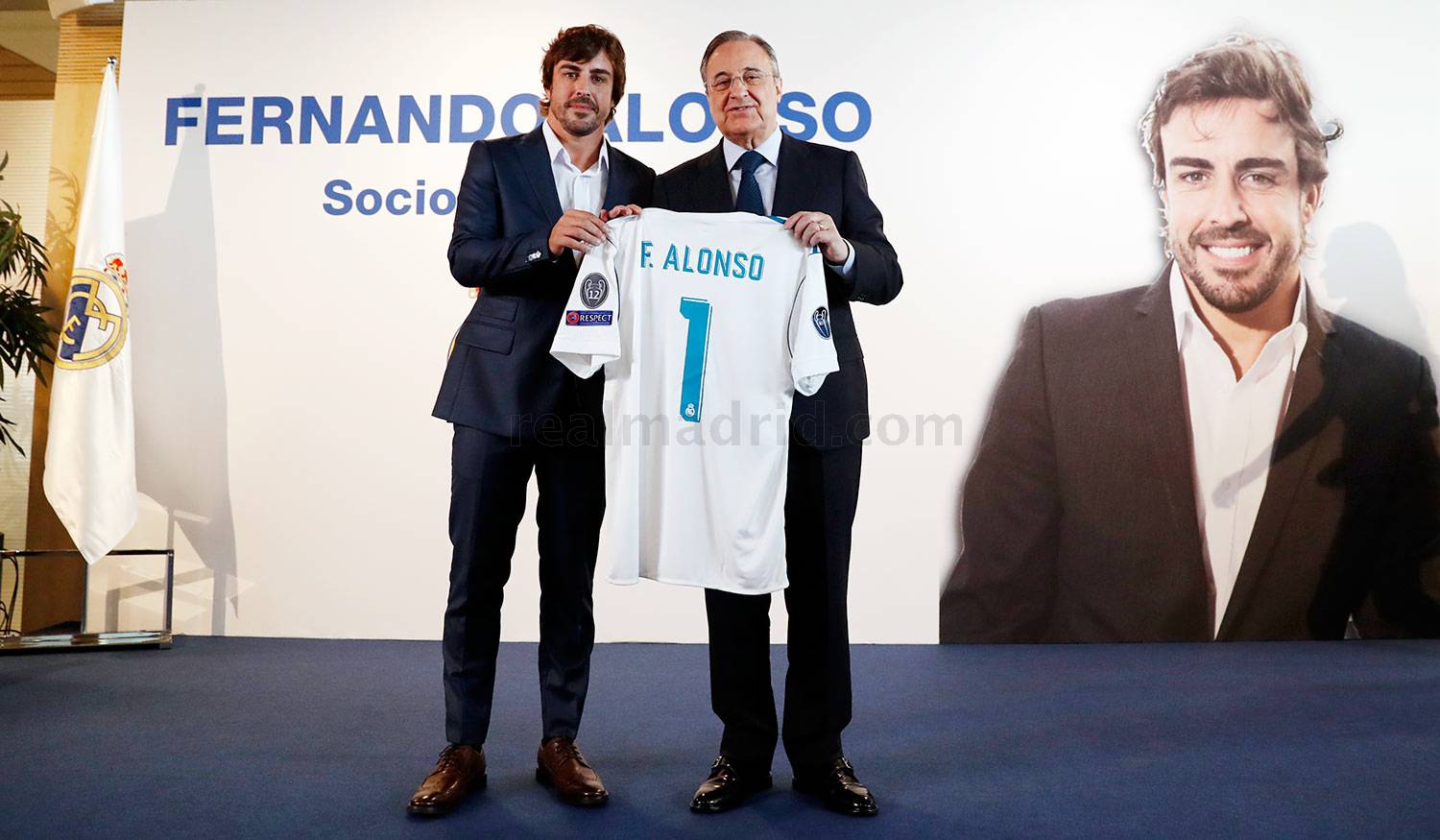 «Фернандо, для всех мадридистов ты великолепный представитель нашего клуба, именно поэтому Генеральная ассамблея приняла единогласное решение назначить тебя почётным сосьо «Мадрида». Ты, двукратный чемпион мира в Формуле-1 и трехкратный обладатель серебра, дебютировал в 19 лет, и с того момента только увеличивал количество выигранных премий, завоевав всего 32 трофея. Ты представляешь не только трассы Формулы-1, ты представляешь Испанию на всех континентах и «Реал Мадрид» – благодаря своей любви к клубу. Мы знаем, что значит эта футболка и этот герб для тебя».