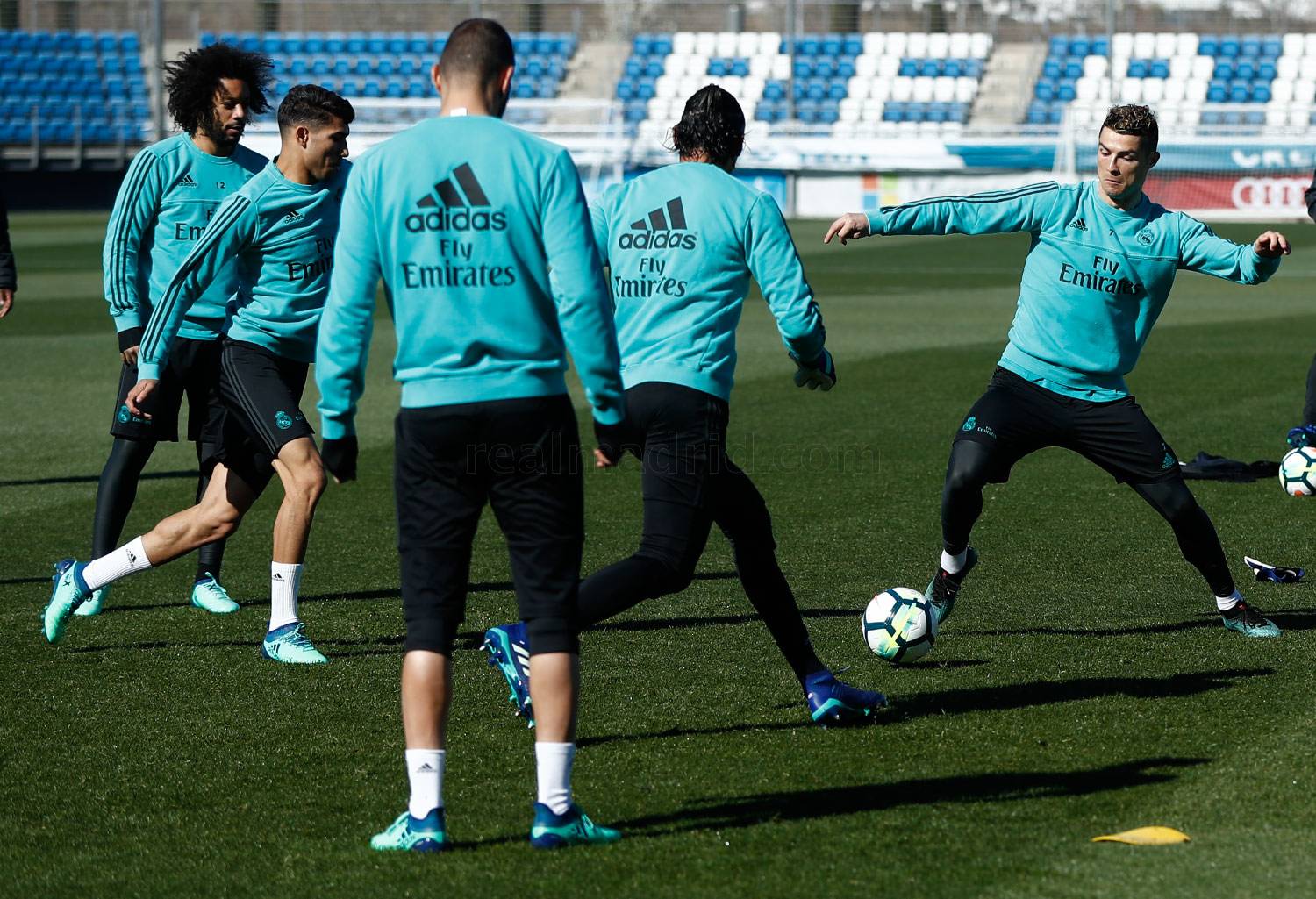 В начале тренировки футболисты разделились на два рондо, после чего продолжили детальную подготовку к завтрашнему матчу. Иско и Серхио Рамос тренировались в зале.