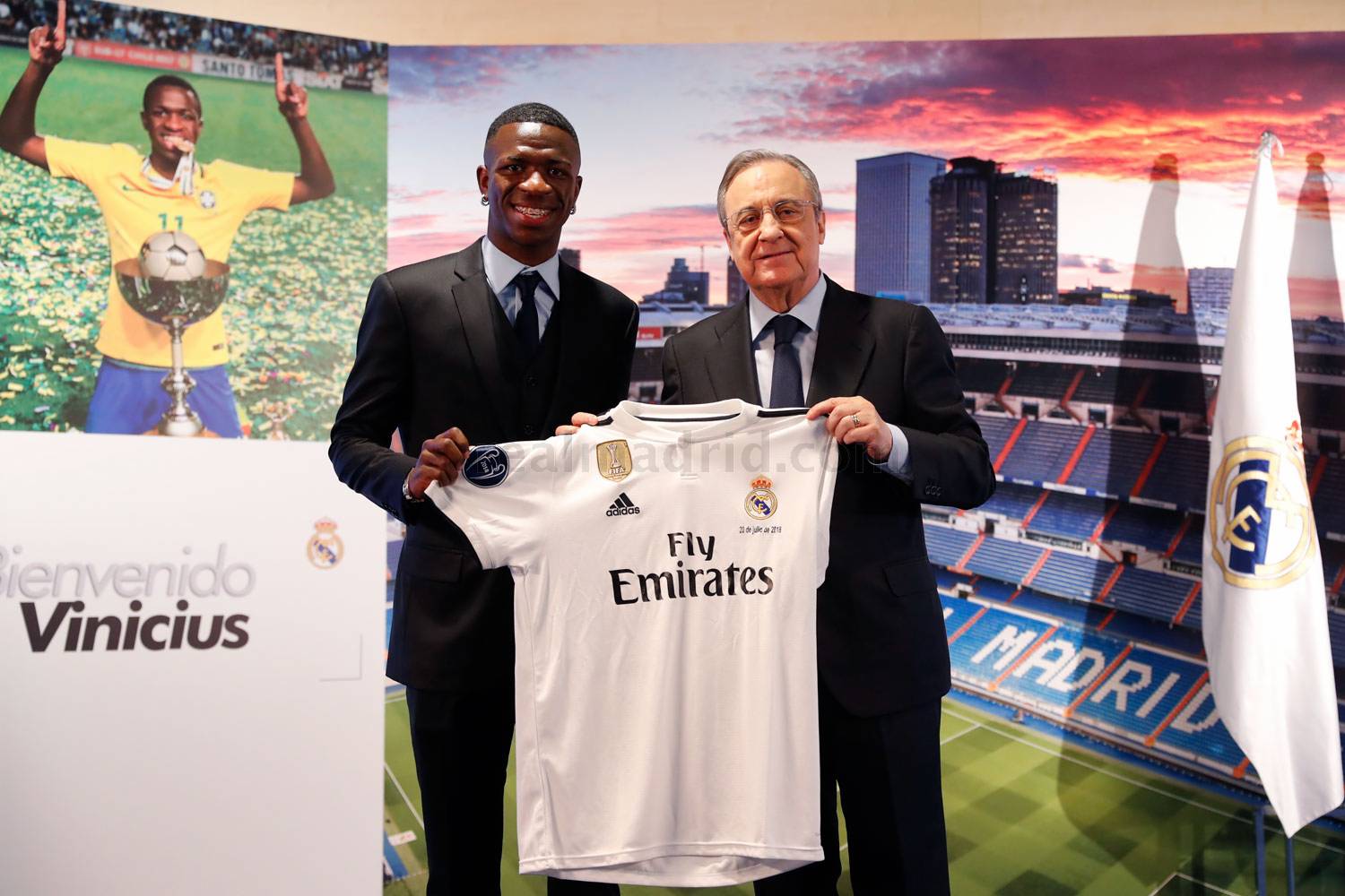 В почетной ложе «Сантьяго Бернабеу» состоялось представление Винисиуса Джуниора в качестве нового игрока мадридского «Реала». Во время презентации было показано видео с лучшими моментами выступлений бразильца, затем слово взял Флорентино Перес, который поприветствовал 18-летнего футболиста.