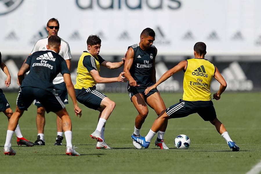 В рамках тренировочного занятия футболисты «Мадрида» выполнили ряд упражнений на владение мячом, после чего сыграли высокоинтенсивный матч на поле уменьшенных размеров. В завершение команда выполнила пробежку на поле №2.