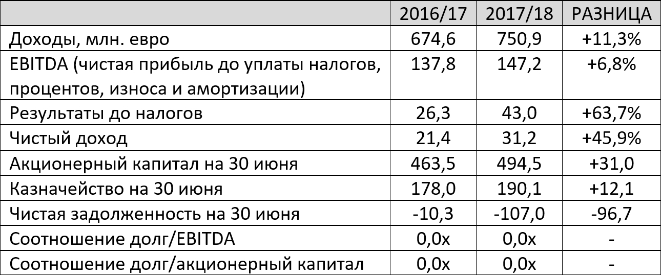 Чистая прибыль до уплаты налогов, процентов, износа и амортизации составила 147,2 млн евро, что на 6,8% больше, чем в предыдущий сезон. Без выигранных титулов EBITDA прошлого сезона достигла бы 170 миллионов евро.
