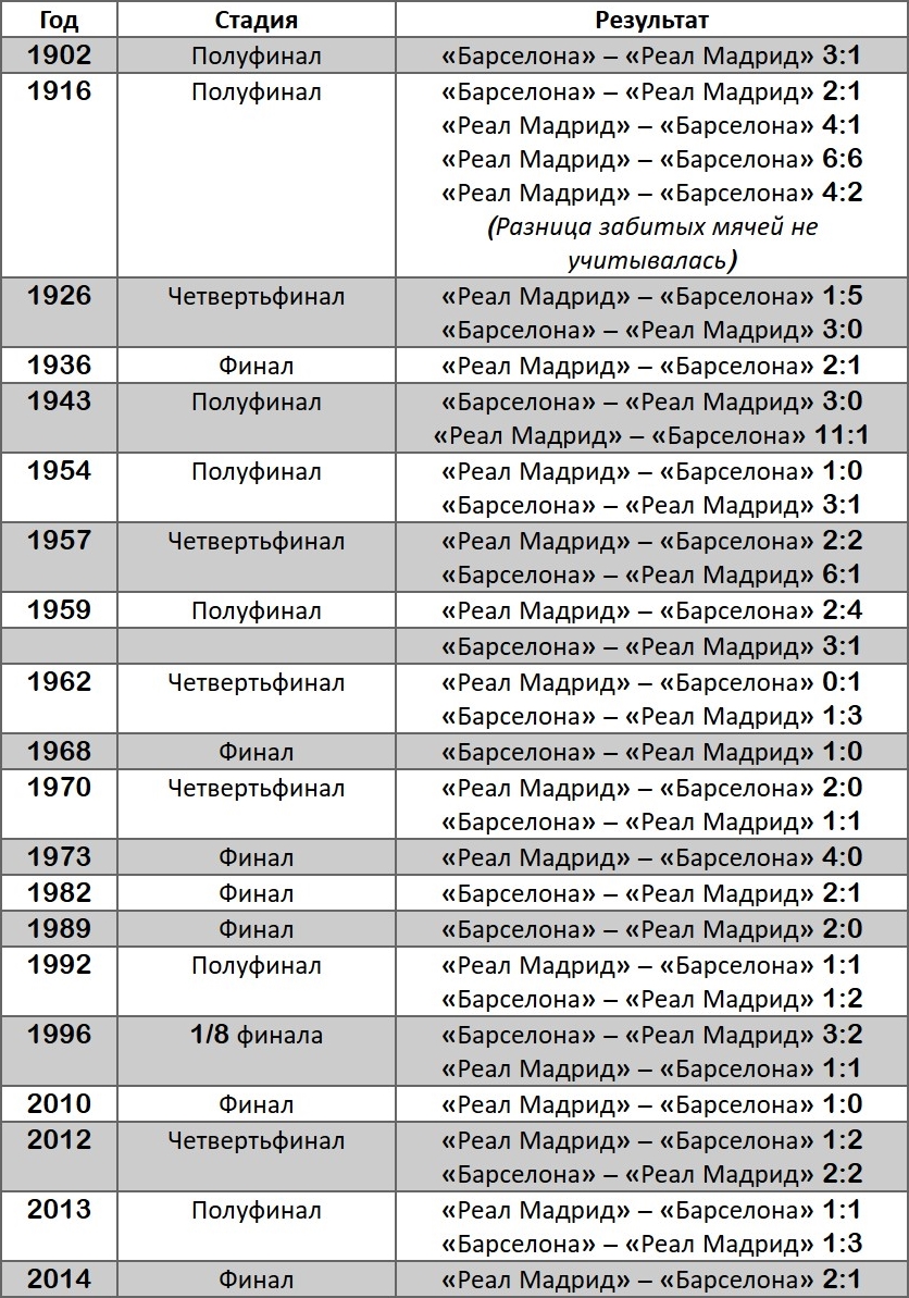 Все поединки плей-офф национального кубка между «Реал Мадрид» и «Барселоной»