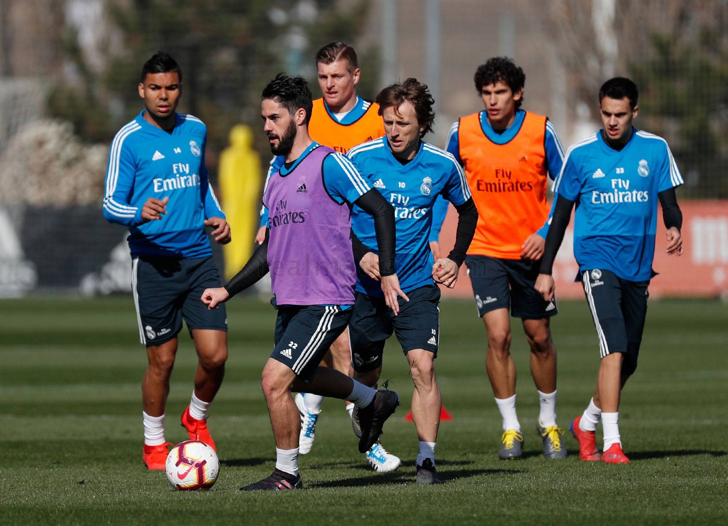 В субботу игроки «Реал Мадрид» провели последнюю тренировку перед поездкой в гости к «Леванте» на матч 25-го тура Ла Лиги. Основное внимание на занятии, к участию в котором Сантьяго Солари привлек вратаря «Кастильи» Моху, было уделено работе с мячом.