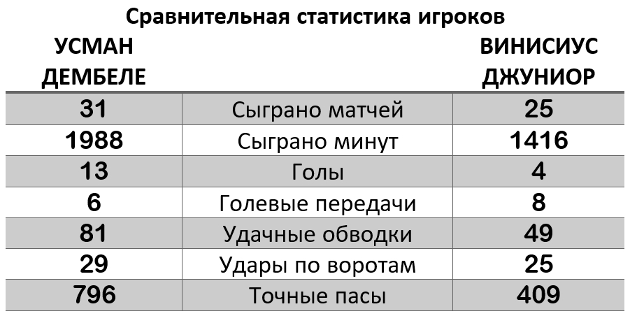 Игра обоих футболистов основывается на обмане соперника: на первом месте у обоих стоит обводка, также очень весомыми аргументами являются скорость и способность менять темп. Бускетс и Модрич контролируют игру в центре поля, а Дембеле и Винисиус ломают эту монотонность – они никого не ждут, их игровой философией является движение по вертикали.