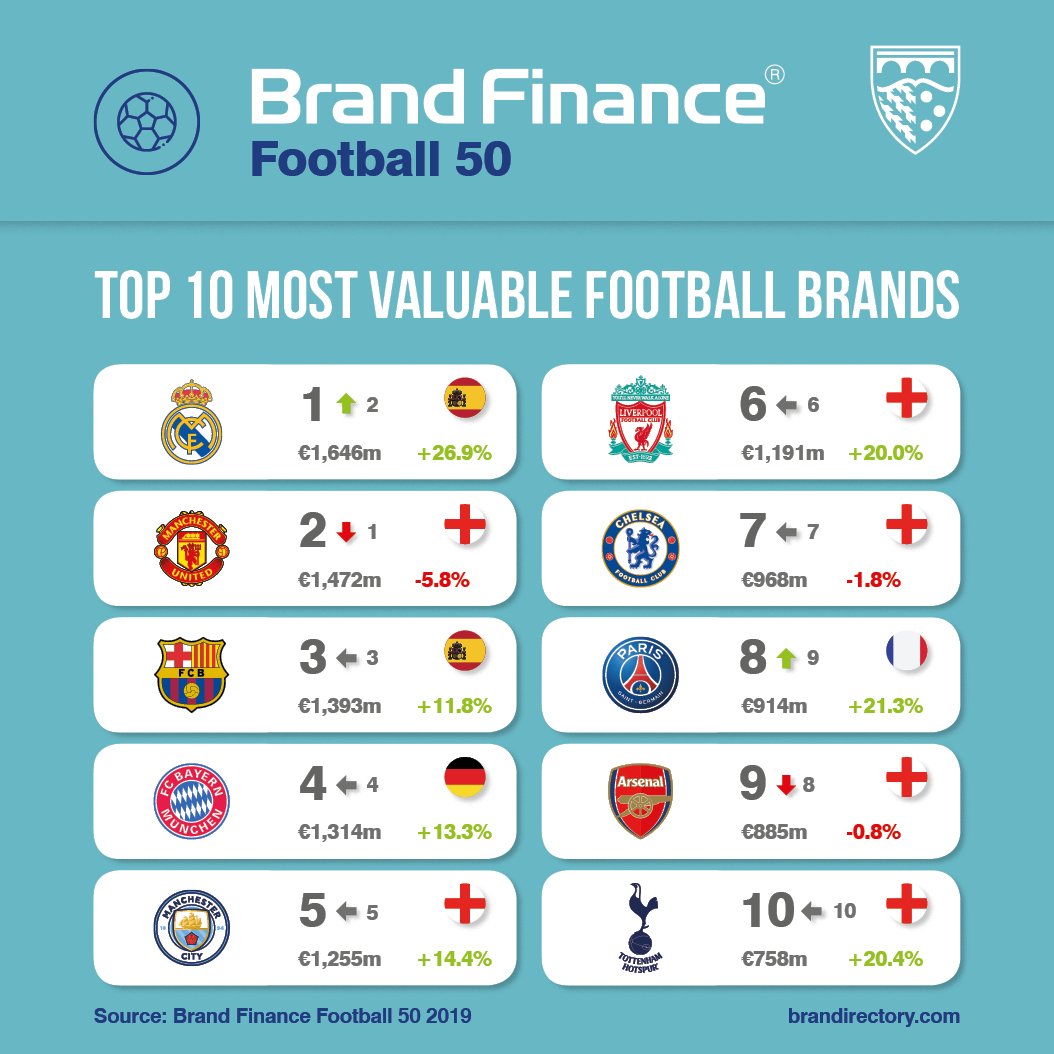 В целом, оценочная стоимость превышает один миллиард всего у шести клубов: за «Мадридом» следуют «Манчестер Юнайтед» (1 472 миллиона), «Барселона» (1 393 млн), «Бавария» (1 314 млн), «Манчестер Сити» (1 255 млн) и «Ливерпуль» (1 191 млн).