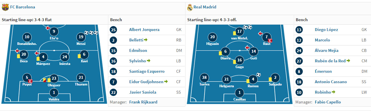 Хозяева поля, несмотря на поражение в Андалусии, считались безоговорочными фаворитами как у букмекеров, так и среди болельщиков. Обе команды вышли играть с тремя форвардами: у «Барсы» это были Роналдиньо, Самуэль Это'о и юный Лео Месси, а у «Мадрида» – Рауль, Рууд Ван Нистелрой и тоже юный Гонсало Игуаин. А вот у своих ворот количество игроков различалось – хозяева играли в три защитника, а гости – в четыре, причем весь квартет составляли испанцы: Мигель Торрес, Иван Эльгера, Серхио Рамос и Мичел Сальгадо. В центре поля тройка Гаго-Гути-Диарра противостояла четверке Деку-Маркес-Иньеста-Хави.