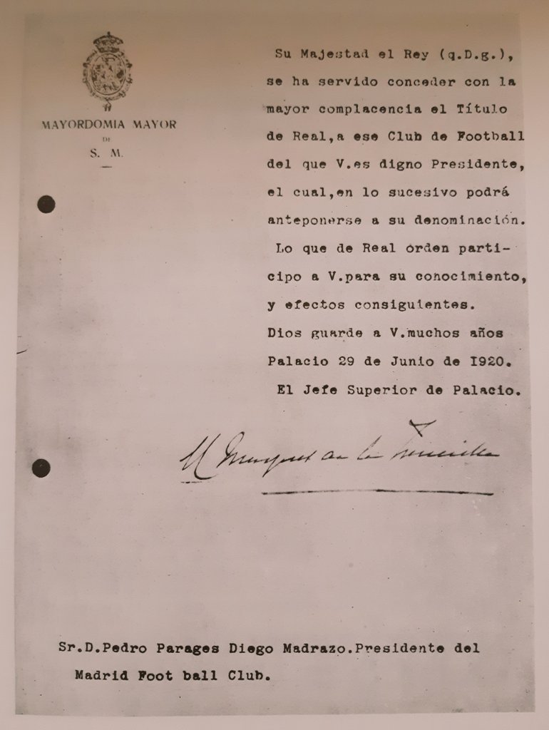 Письмо, направленное из Королевского дворца на имя президента футбольного клуба «Мадрид» Педро Парехаса, гласило следующее: