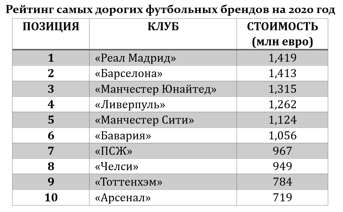 Согласно отчету консалтинговой фирмы Brand Finance, Королевский клуб вновь стал самым дорогим футбольным брендом в мире: стоимость бренда клуба составляет 1419 миллионов евро. «Мадрид» возглавил рейтинг, в котором представлены 50 крупнейших футбольных клубов мира, опередив «Барселону» (1413), «Манчестер Юнайтед» (1315), «Ливерпуль» (1262) и «Манчестер Сити» (1124).