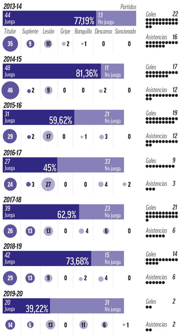 Затем его звезда в «Мадриде» начала постепенно угасать, в основном из-за травм, негативным образом сказавшихся на его карьере. Бэйл ни разу не забил больше, чем в свой дебютный сезон, однако чего у него не отнять, так это умения проявлять себя в решающие моменты: так, его выступление в финале Лиги Чемпионов в Милане, увенчавшемся Ундесимой – гол в серии пенальти, получилось эффектным. Также он блистал на Клубном Чемпионате Мира в 2014-м. Но отдельного упоминания заслуживает его дубль в финале в Киеве, особенно – гол через себя, который вошел в историю «Мадрида» и трех побед подряд в Лиге Чемпионов.