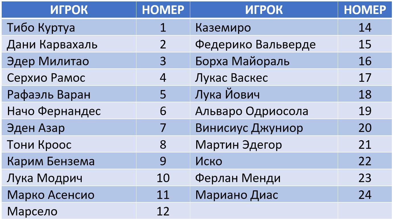 Номера игроков «Реал Мадрид» на сезон 2020/21: