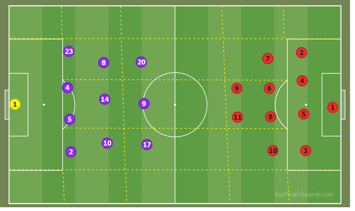 На изображениях выше показана базовая тактика «Реал Мадрид» при владении мячом против типичной команды с низкой обороной. Попытавшись внедрить в «Мадриде» концепцию позиционной игры, Зинедин Зидан видел, как в начале сезона команда изо всех сил пыталась перемещать мяч быстрее по горизонтали. Но в вышеупомянутой мини-серии передачи стали более быстрыми, соответственно возрос риск стать более уязвимыми для контратак. Без улучшения контрпрессинга команда Зидана пострадала бы (как и упоминал Зидан на каждой конференции до и после матча) намного больше, если бы не добилась этих изменений в прошедших девяти играх. Однако «сливочные» не допустили этого.