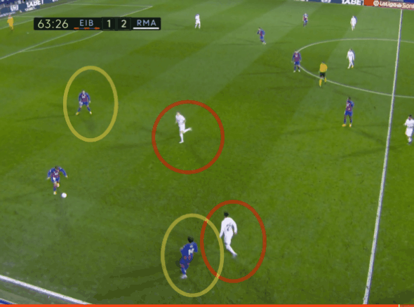 В ситуации, когда Ферлан Менди или Винисиус теряли мяч в районе левого фланга, «Реал Мадрид», как было замечено, использовал тандем персонально- и пространство-ориентированного контрпрессинга. Персонально-ориентированный прессинг позволяет противнику сделать первый пас, но все варианты его получения при этом оказываются в центре внимания прессингующих. Аналогичная концепция применяется при пространство-ориентированном прессинге, но разница заключается в том, что игроки перекрывают пространство на потенциальных путях движения мяча, а не самого потенциального получателя. Ярким примером этого является игра против «Эйбара»: кадр на 64-й минуте – пример персонально-ориентированного прессинга, а на 58-й минуте мадридский «Реал» давил на пространство: