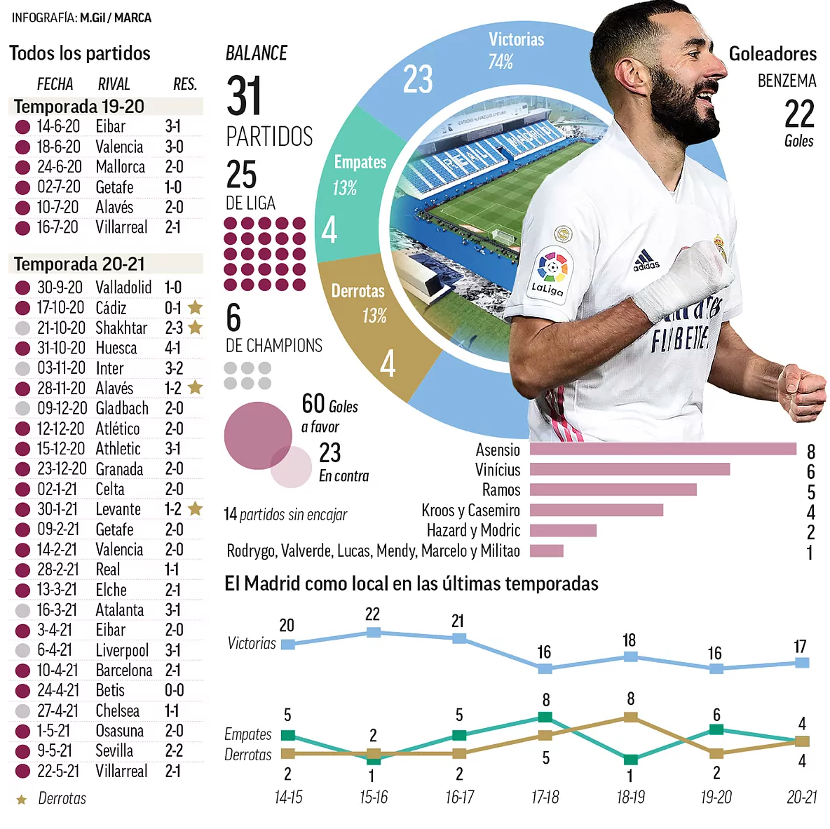 «Сливочные» сыграли 31 матч во всех соревнованиях на «Ди Стефано». На счету команды 23 победы, четыре ничьи и четыре поражения. Самой особенной, несомненно, была победа над «Вильярреалом» 14 июня 2020 года, которая принесла Королевскому клубу титул чемпиона Ла Лиги.