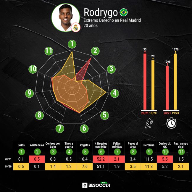 Сезон 2020/21 Родриго завершил, сыграв 1298 минут и забив 2 гола: один из них принес «Мадриду» победу (3-2) в первом матче группового этапа Лиги Чемпионов против «Интера», а другой был забит в победном матче с «Гранадой» (4-1) в 36-м туре Ла Лиги. В то же время на счету бразильца 7 голевых передач (шесть в Ла Лиге и одна в Лиге Чемпионов). В предыдущем, дебютном, сезоне он сыграл 1428 минут в составе первой команды и 268 минут в составе «Кастильи». Тогда он забил 7 голов (два в Ла Лиге, один в Кубке Короля и четыре в Лиге Чемпионов, включая хет-трик в матче с «Галатасараем») и отдал 3 результативные передачи (все в Лиге Чемпионов). После двух лет роста под руководством Зидана, теперь пришло время идти вперед под руководством Анчелотти.