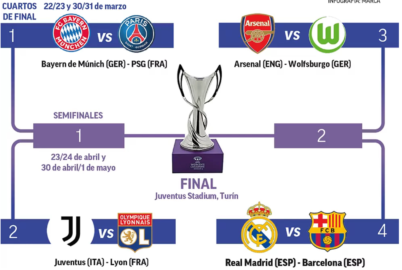 Первая игра состоится 22/23 марта в Мадриде, а ответная через неделю, 30/31 марта в столице Каталонии. Примечательно, что 12/13 марта команды встретятся между собой в рамках 14 тура Лиги Ибердрола.
