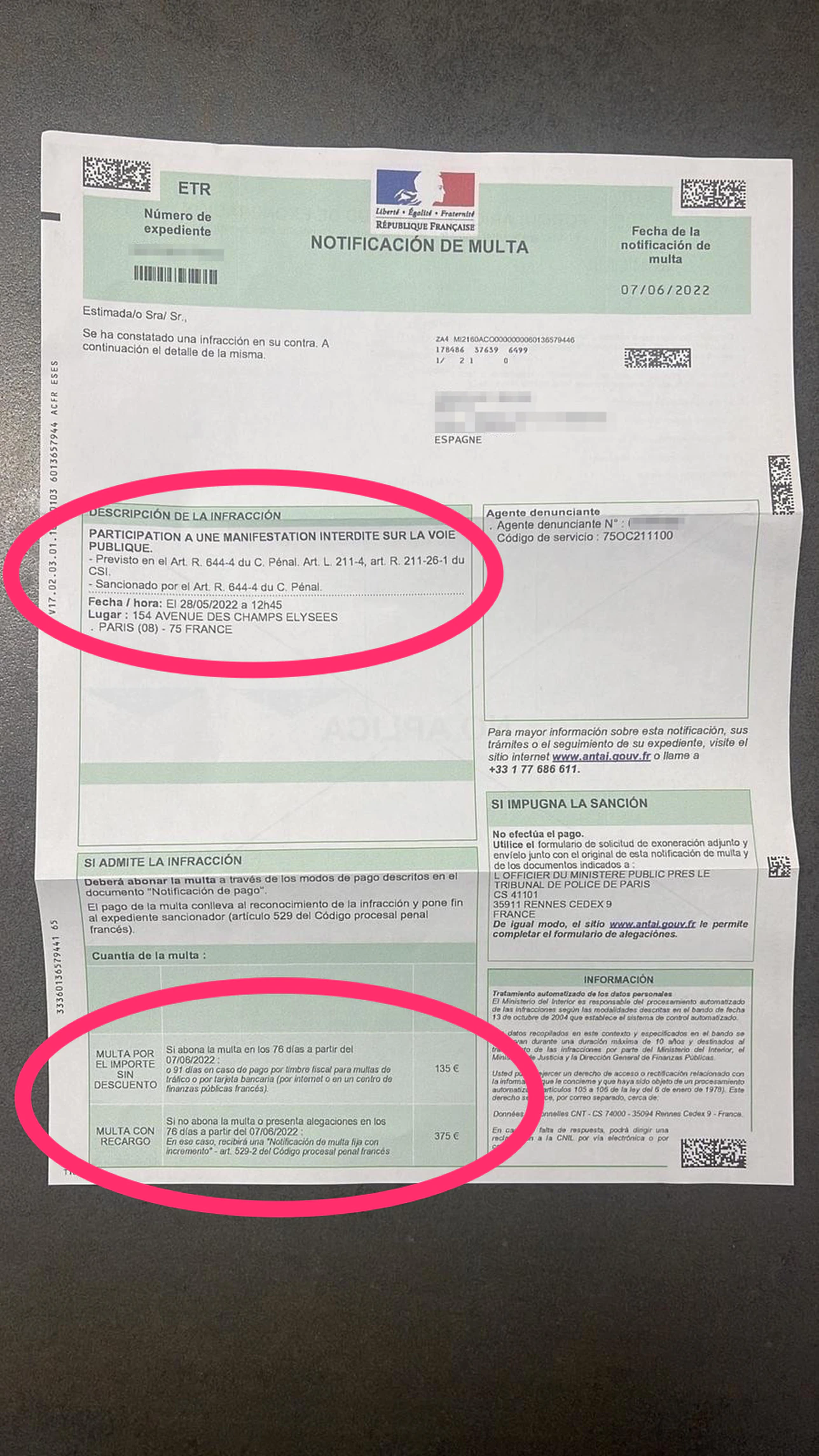 «Мы не можем в это поверить, мы даже не пели», – говорит Давид Гонсалес, 41-летний мужчина, мадридиста и член фан-клуба «Вильяхимена», с которым он приехал посмотреть финал против «Ливерпуля». В составе группы был подросток 15-ти лет, 70-летний мужчина и четыре взрослых, всем около 40. Они приехали в Париж в день финала и прогуливались по центру города за несколько часов до матча, с футболками и флагами, как и многие из присутствующих. В какой-то момент, когда они шли по Елисейским полям, несколько полицейских попросили их предъявить удостоверения личности и, сфотографировав их, разрешили продолжить путь. Болельщики посчитали это единичным случаем, простыми мерами безопасности. Однако спустя месяц, им пришел штраф за участие в «демонстрации, запрещенной в общественных местах». Общая сумма к оплате составляет 375 евро (минимальная сумма – 135 евро). Издание AS связалось с Давидом, одним из тех, кто пострадал: