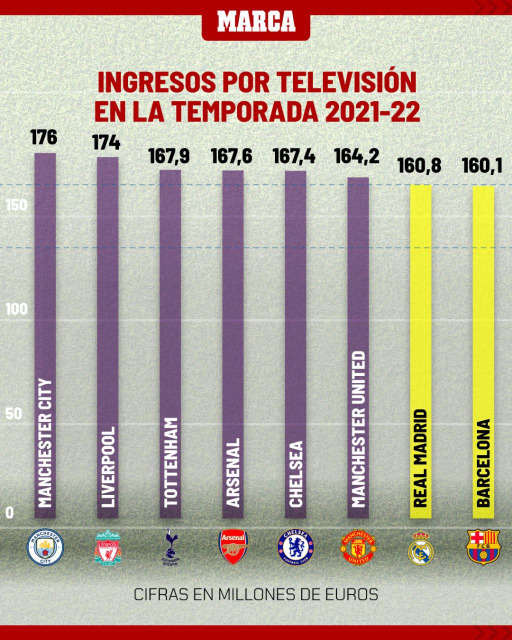 Сравнение прибыли клубов за сезон 2021/22 от ТВ-контрактов национальных чемпионатов.
