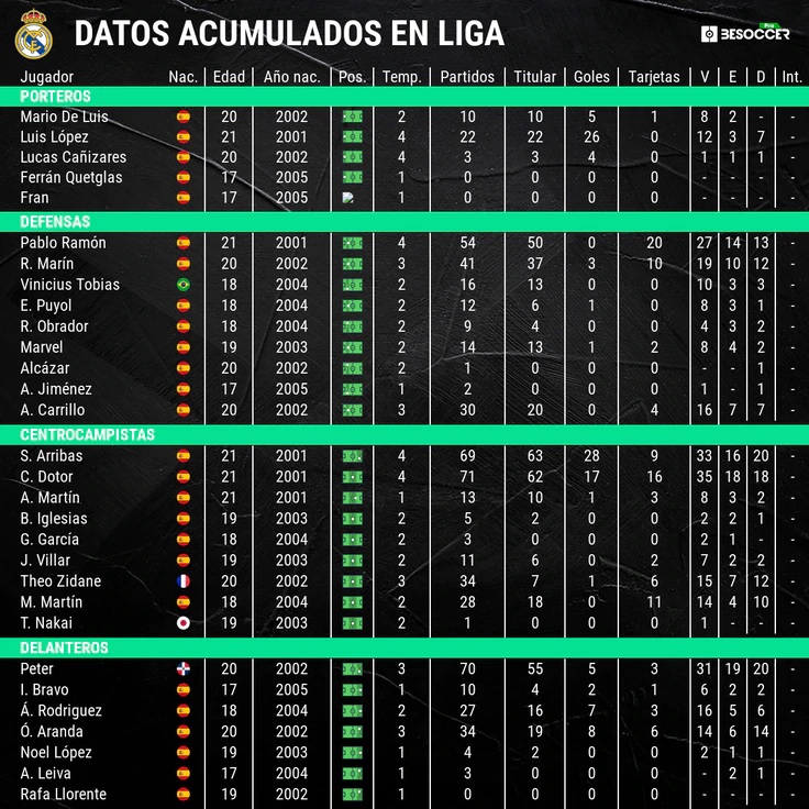 Рауль нашел рецепт стабильности после нескольких сезонов (это его четвертый сезон в «Кастилье»), когда моменты блеска чередовались с разрывами, из-за которых проекты «Кастильи» «садились» на мель у берега. Рауль, горячо верящий в молодость, поддерживает эту линию с Альваро Родригесом (18 лет), Икером Браво (17), Винисиусом Тобиасом (18), Эдгаром (18) и Марио Мартином (18) в качестве главных компонентов, но при поддержке так называемых ветеранов, таких как Аррибас, Дотор и Рафа Марин. Три футболиста, которые в свои 20-21 год уже имеют опыт, чтобы вносить свой вклад на каждой линии. Дифференцированный игрок, бокс-ту-бокс, сочетающий в себе слово «баланс» и иерархический и элегантный центральный защитник. Все это приправлено Марио де Луисом, который заслужил место в составе благодаря своим решающим сэйвам.