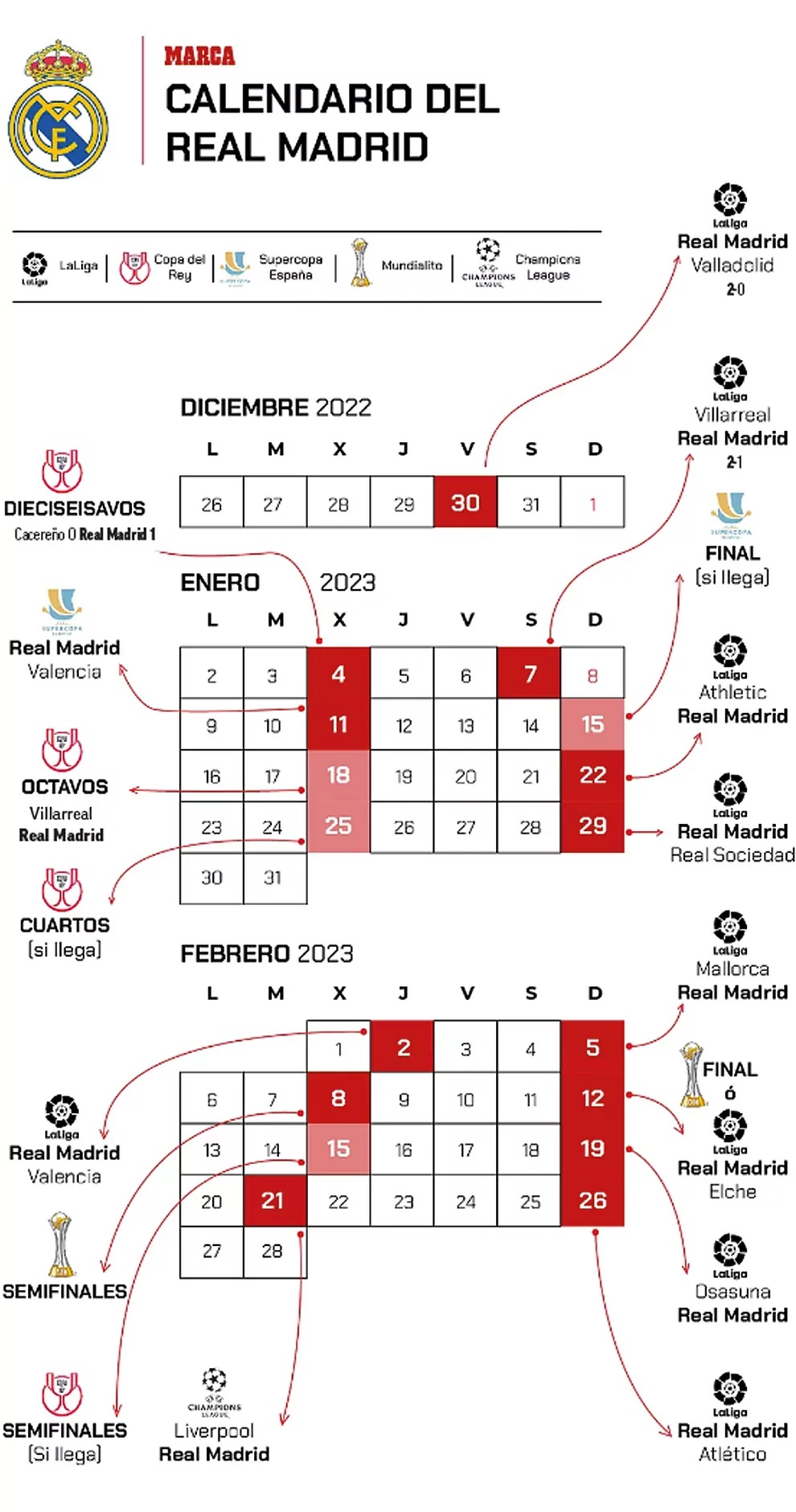 «Мадрид» не даст заскучать любителям эмоциональных матчей – в феврале команда сыграет на Клубном Чемпионате Мира (с 1 по 11 в Марокко), а потом запланирована поездка на «Энфилд», на первый матч 1/8 финала Лиги Чемпионов 21 февраля. Однако, до этого еще далеко, сначала нужно преодолеть январские испытания.