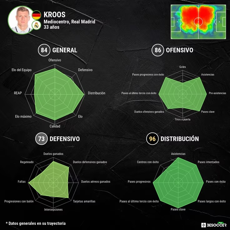 Больше цифр: Кроос является вторым игроком по количеству передач в Примере (1281, всего на 14 меньше, чем у Парехо) и первым по количеству успешных пасов (1219; у Парехо – всего 1161). На основе данных Olocip, Кроос является третьим игроком по влиянию на игру «Мадрида» в этом сезоне, его опережают только Винисиус и Феде Вальверде (как и по количеству сыгранных минут, что любопытно). Он является лидером команды по генерируемой ценности: смена игры, отборы, успешные передачи, общее количество передач и передачи вперед. Кроме того, в этом сезоне на его счету уже два гола (в ворота «Кадиса» и «Атлетика») и четыре голевые передачи.