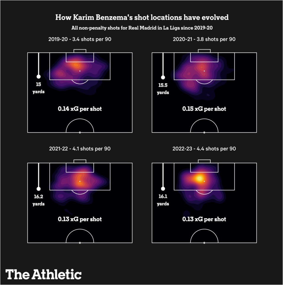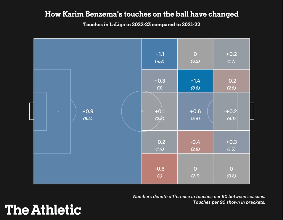Многие из его общих статистических показателей похожи, если не совпадают, с показателями прошлого сезона. По данным Opta, в этом сезоне Карим совершает примерно одинаковое количество касаний в штрафной соперника за игру: 7,2 в этом сезоне против 7,4 в прошлом. Роль Бензема в плане создания моментов также не изменилась: его ожидаемые ассисты за игру остались прежними (0,2), в то время как на самом деле Карим создает больше шансов за игру (2 в этом сезоне по сравнению с 1,8 в прошлом). Как показано на графике ниже, он больше участвует в построении атак «Мадрида», и даже больше его касаний приходится на левую половину поля.