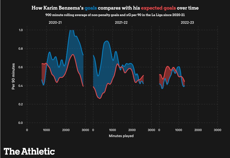 Но Бензема, несомненно, переживает спад, когда речь заходит о его эффективности перед воротами. Его коэффициент реализации ударов значительно снизился. По данным Opta, в этом сезоне он забил 16,5% из 109 ударов, в то время как в прошлом сезоне он реализовал 24,2% из 182 ударов. В предыдущих сезонах количество забитых мячей Бензема постоянно превышало его показатель xG, но в розыгрыше 2022/23 это не так. Это говорит о том, что он по-прежнему оказывается на выгодных позициях, но не может реализовать свои шансы с такой же поразительной точностью. Это показано на графике ниже, где голы Бензема (синяя линия) противопоставлены его ожидаемым голам (красная линия).