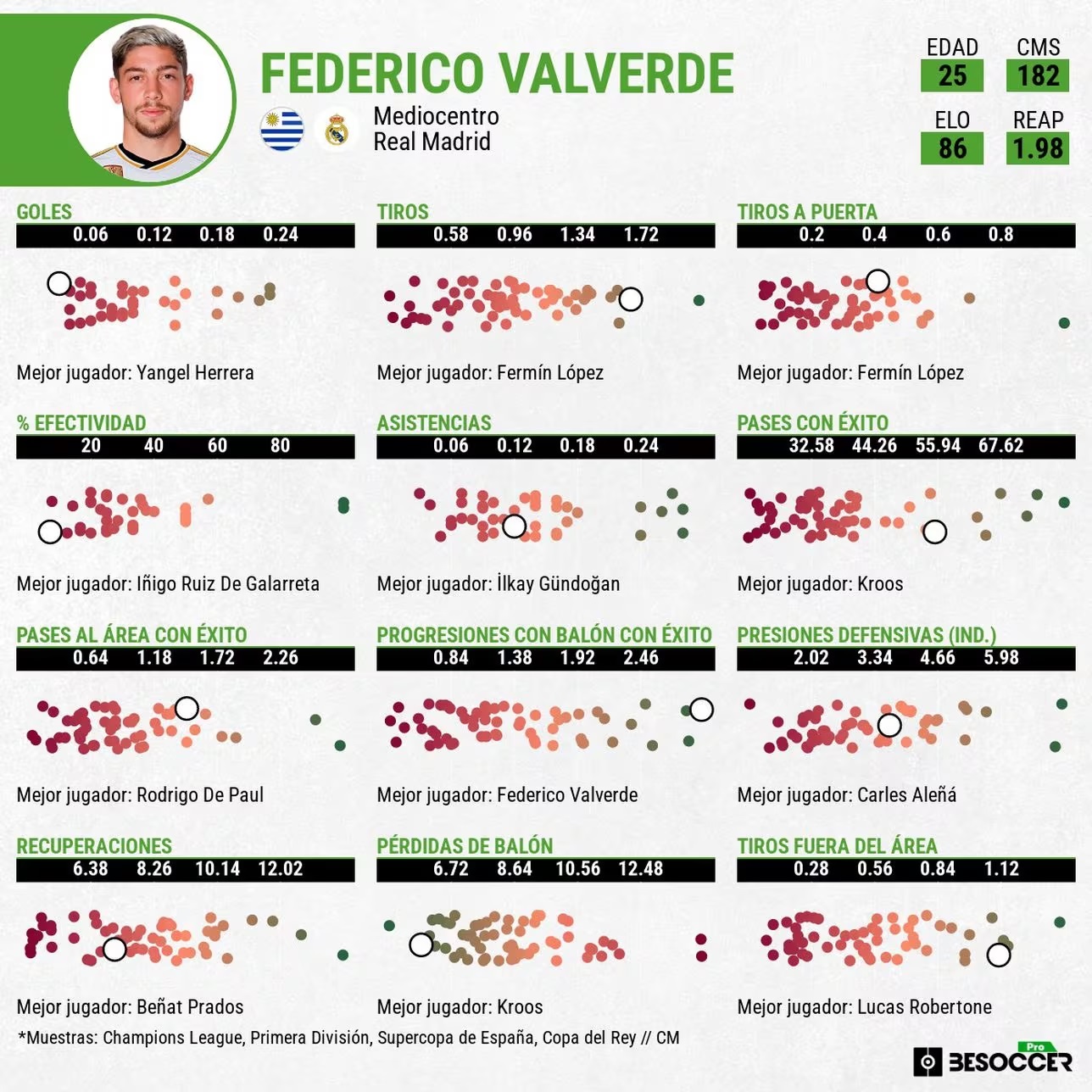 В этом сезоне Анчелотти изменил роль Вальверде, назначив его на более глубокие участки поля, чтобы использовать его сильные стороны и раскрыть набор навыков, которые традиционно не ассоциируются с его динамичным стилем «box-to-box». Вальверде показал себя не только как рабочая лошадка: особенно стоит отметить его креативность и вертикальные передачи.