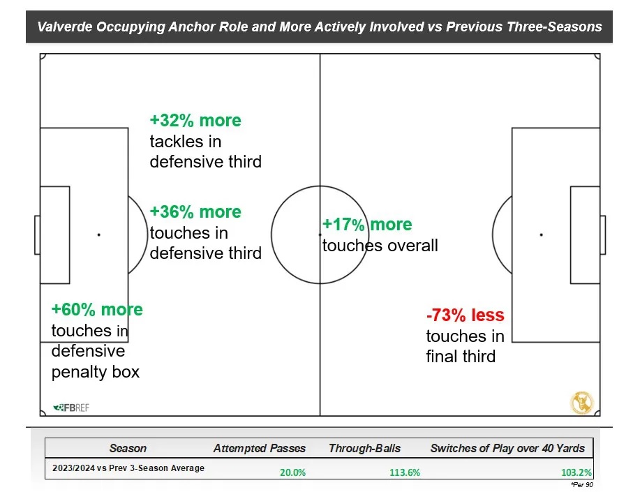 В новой роли Вальверде не ограничивается только передачами и вертикальным пасом. Количество его касаний и попыток передач увеличилось почти на 20% по сравнению с последними тремя сезонами, что говорит о его растущем влиянии в команде. Разительный контраст в его касаниях в оборонительной и финальной третях подчеркивает значительное изменение его роли. Анчелотти эффективно использует Вальверде в роли «ложного правого защитника», когда команда владеет мячом, способствуя продвижению Дани Карвахаля в качестве правого вингера, в то время как Вальверде прикрывает его. Роль уругвайца в «остальной обороне» (подразумевается, как команда организует оборону, когда владеет мячом) демонстрирует его скорость восстановления, дальний пас и способность выводить мяч из глубины поля, позволяя Анчелотти использовать его лучшие качества.