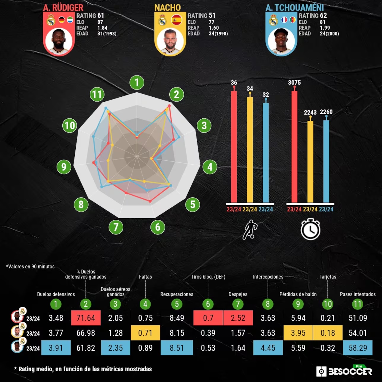 В этом плане Чуамени превосходит Начо и не уступает Рюдигеру. Хоселу выигрывает 2,5 дуэли в воздухе. Серебро – у француза (2,4); бронза – у немца (1,8). Четвертое место у Начо – 1,3 дуэли за 90 минут. Что касается выносов головой, то золото у Рюдигера (2,1), а Чуамени вновь опередил Начо (1,3 против 1,1). Та же динамика наблюдается и в штрафной зоне соперника: Хоселу (1,5), Беллингем (0,4), а затем Рюдигер и Чуамени (0,34 и 0,31). Начо, после Алабы (0,26), с 0,16. Влияние, которое также проявляется и в голевом аспекте: по два гола у немца и француза, ноль у испанца. В этом и заключается суть вопроса.