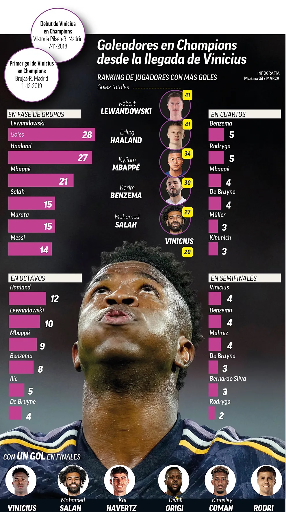 Если составить список бомбардиров, взяв за отправную точку дебют Винисиуса за «Мадрид» в Лиге Чемпионов, то его возглавят Холанд и Левандовски с 41 голом. По голам на групповом этапе поляк занимает первое место, имея на один гол больше, чем норвежец (28 против 27). 1/8 финала является территорией норвежца (12), а игроки «Мадрида» появляются в четвертьфинале (по пять голов у Бензема и Родриго).