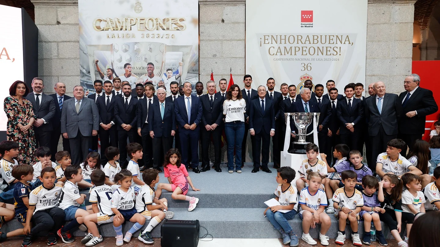 После речей было сделано традиционное групповое фото, а затем наступил один из самых долгожданных моментов, когда игроки и Анчелотти вышли на балкон правительства, чтобы продемонстрировать трофей болельщикам, собравшимся на площади Пуэрта-дель-Соль.