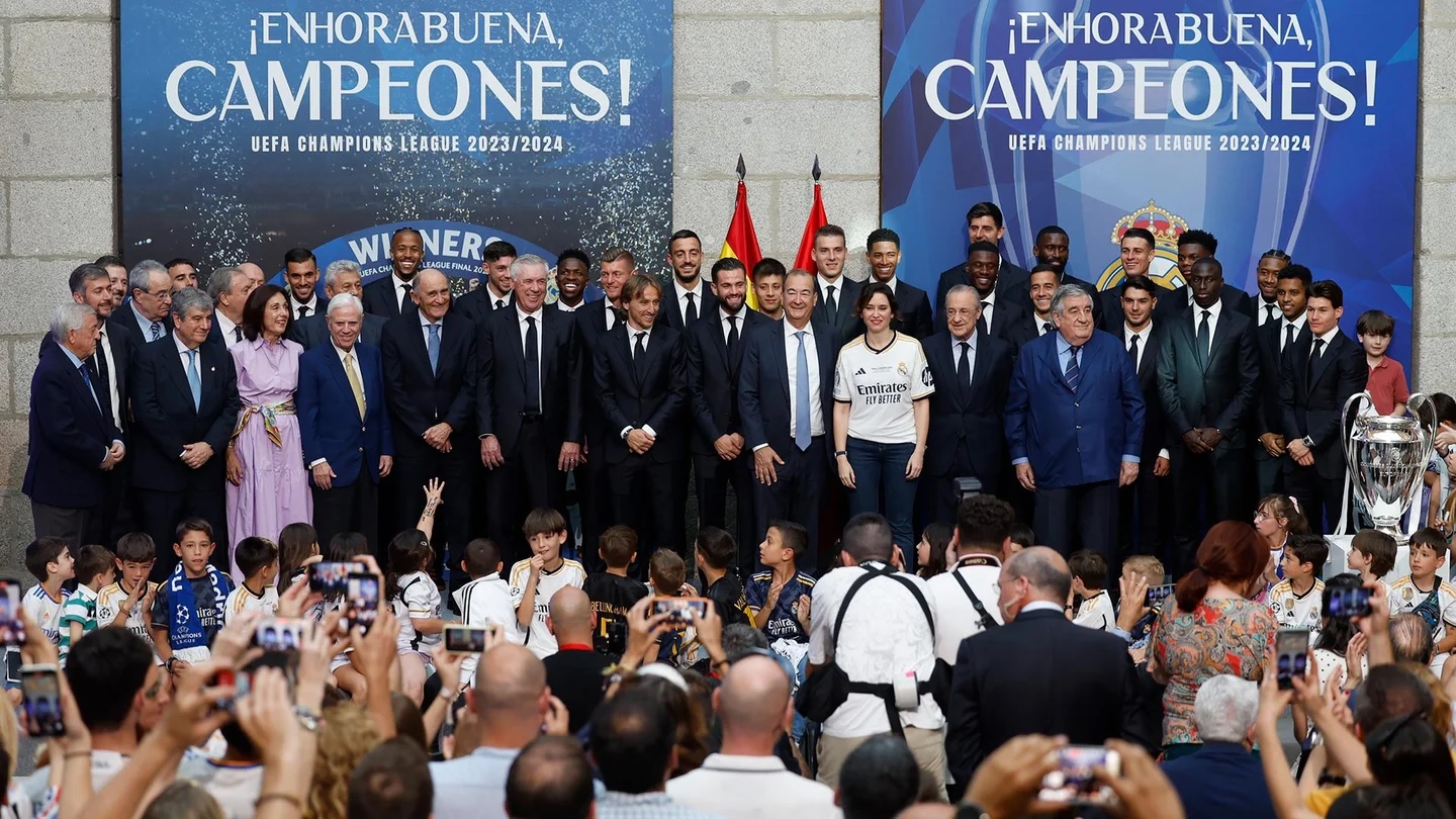 После речей было сделано традиционное групповое фото, а затем наступил один из самых долгожданных моментов, когда игроки и Карло Анчелотти вышли на балкон штаб-квартиры мадридского сообщества, чтобы продемонстрировать трофей болельщикам, заполнившим площадь Пуэрта-дель-Соль.