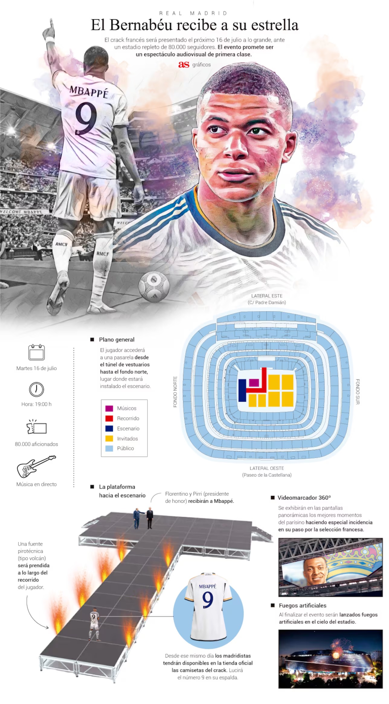 Флорентино будет ведущим церемонии, а Пирри (легенда «сливочных» и почетный президент) будет рядом с ним. Гости будут находиться на площадке, установленной на поле. На панорамном видео табло с углом обзора 360° будут демонстрироваться кадры великолепной карьеры парижской звезды, в частности победный для Мбаппе Чемпионат Мира 2018. Фейерверк и множество сюрпризов будут сопровождать первый день Килиана в стане «сливочных».